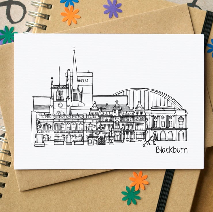 A blank card featuring a skyline illustration of some of Blackburn's greatest landmarks.