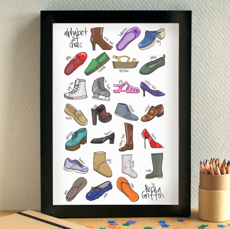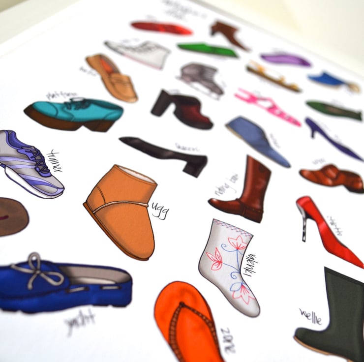 A print of an entire alphabet of fabulous shoes - featuring footwear from ankle boots to zories!