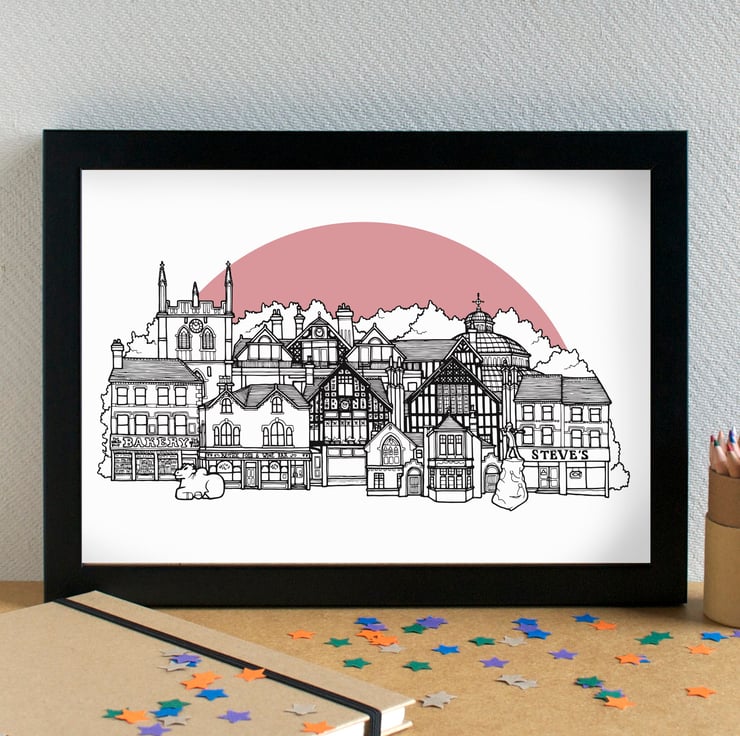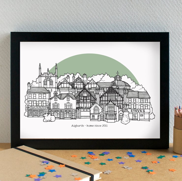 A pretty, detailed print of my skyline illustration of the most famous contemporary landmarks in South Liverpool's Aigburth.