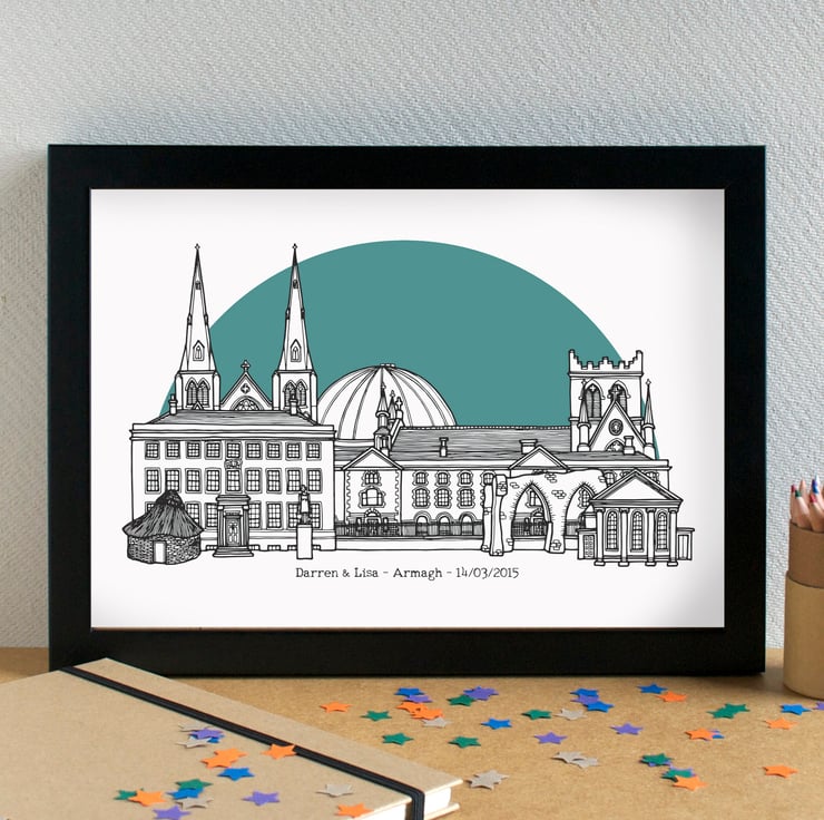 A pretty, detailed print of my illustration of the most famous landmarks in Armagh.