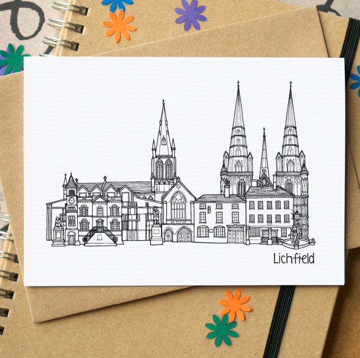 A blank card featuring an illustration of some of Lichfield's greatest landmarks.
