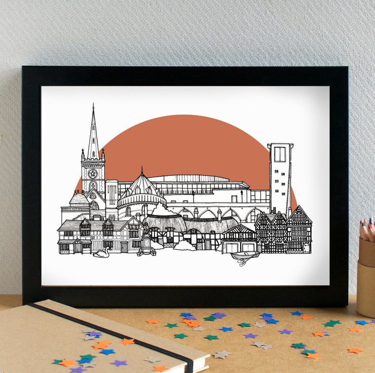 My Stratford-upon-Avon illustration was drawn using pen and ink, by hand, and has then been digitally manipulated to come up with the final image. It features Shakespeare's Birthplace, Anne Hathaway's Cottage, Stratford-upon-Avon Boat Club, The Garrick pub and Harvard House, Royal Shakespeare Theatre, the Swan Theatre, Holy Trinity Church and Clopton Bridge. The image is finished off with the Shakespeare statue, a little swan and a little rowing boat.