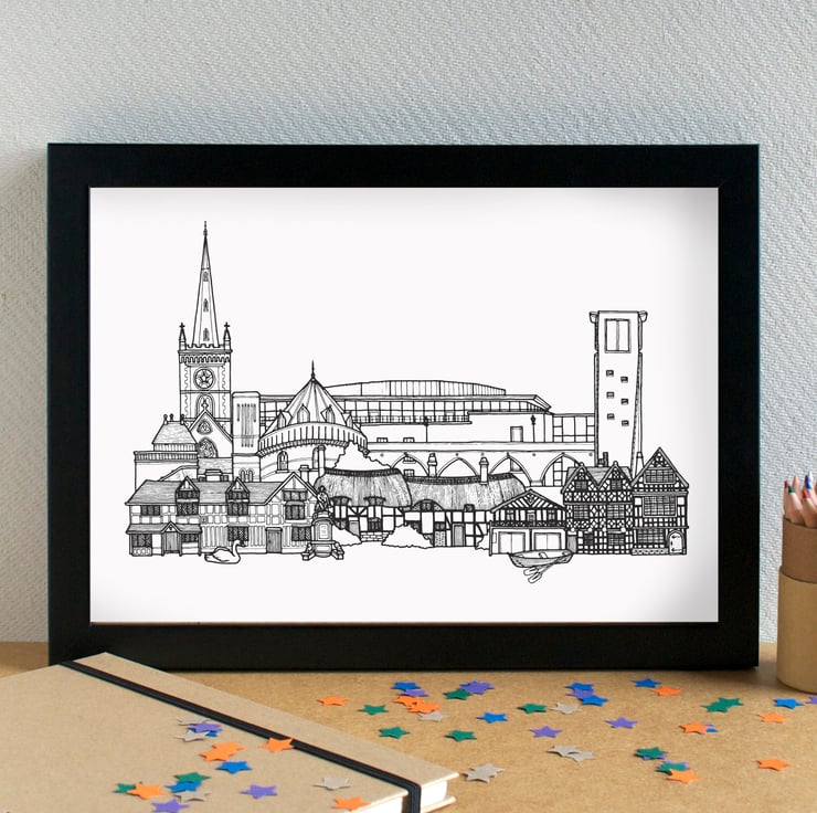 A black and white print of my illustration of the most famous landmarks in Stratford-upon-Avon.