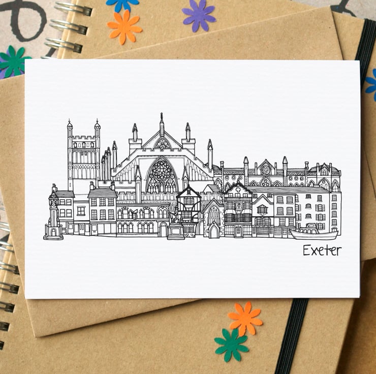 A blank card featuring an illustration of some of Exeter's greatest landmarks.