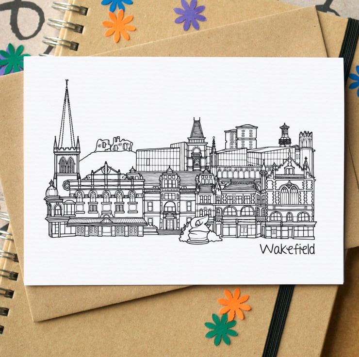 A blank card featuring an illustration of some of Wakefield's greatest landmarks.