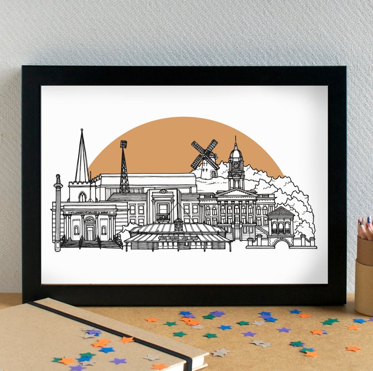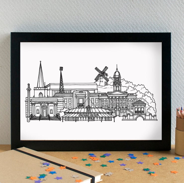 A pretty print of my skyline illustration of the most famous landmarks in Wirral's Birkenhead.
