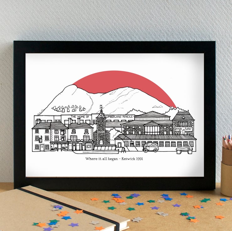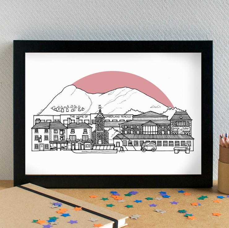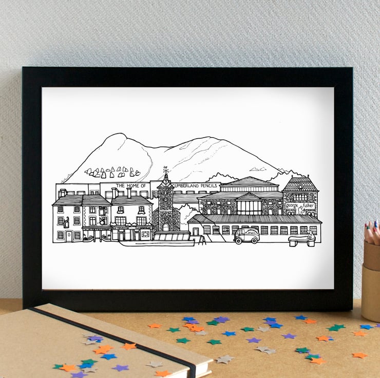 A stunning print of my illustration of the most famous landmarks in the pretty town of Keswick, Cumbria.