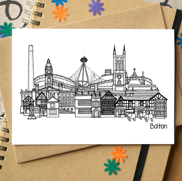 A blank card featuring a skyline illustration of some of Bolton's greatest landmarks.