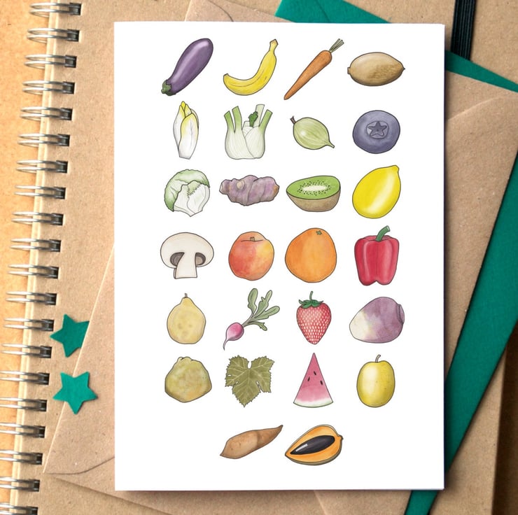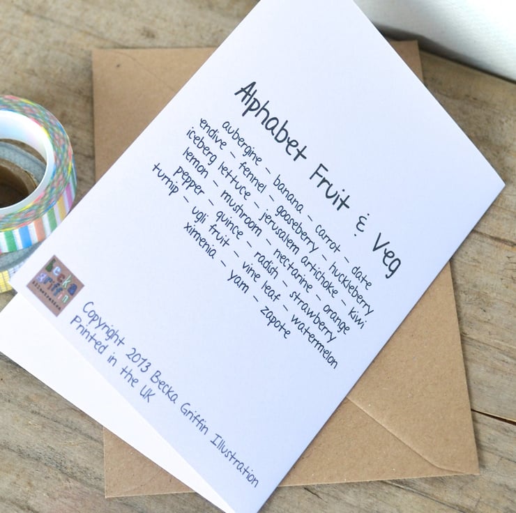 A fabulously colourful alphabet card. This one features a piece of fruit or a vegetable for each letter of the alphabet!