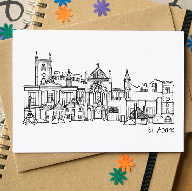 A blank card featuring a skyline illustration of some of St Albans' greatest landmarks.