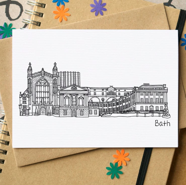 A blank card featuring a black and white skyline illustration of some of Bath's most iconic landmarks.