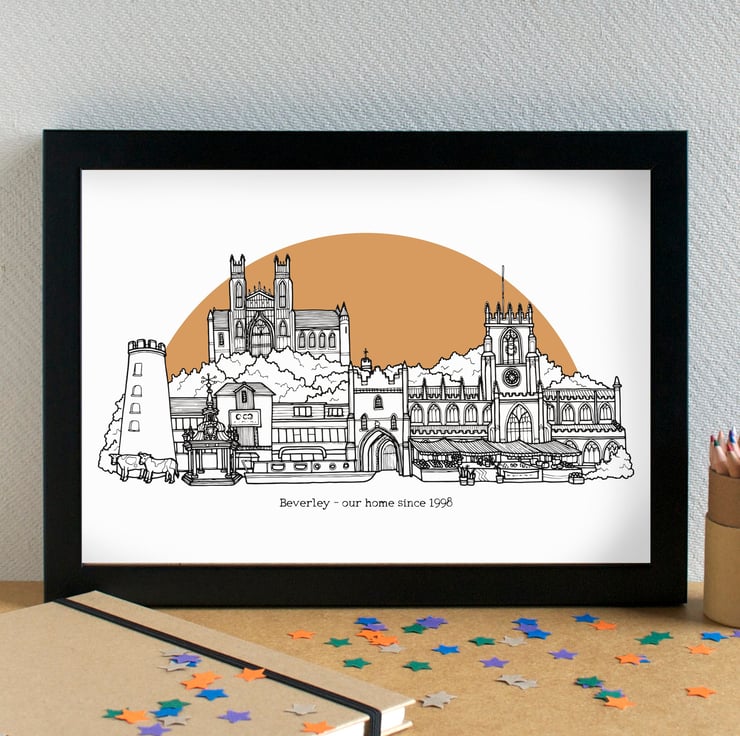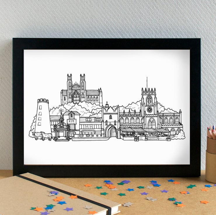 A print featuring my line-drawn illustration of the most famous contemporary landmarks in Beverley, East Yorkshire.
