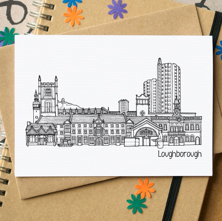 A blank card featuring a skyline illustration of some of Loughborough's greatest landmarks.