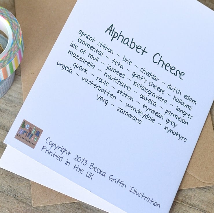 This is my favourite alphabet. Cheese is one of my my favourite foods, so I was always going to have a soft spot for a cheese alphabet! It's a great birthday card for any cheese-lover, or perfect as a "thinking of you" notecard for any fan of cheese.