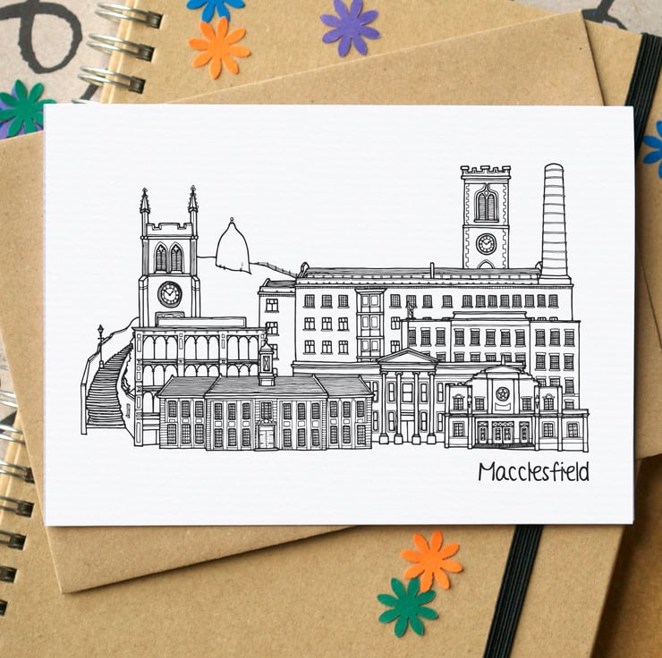 A blank card featuring an illustration of some of Macclesfield's greatest landmarks.