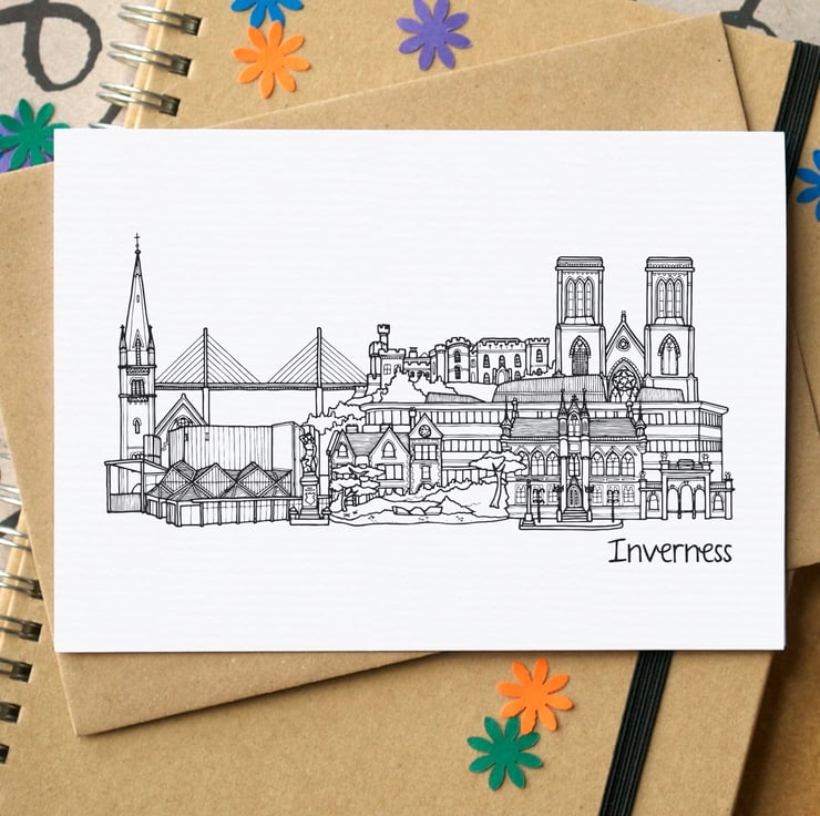A blank card featuring an illustration of some of Inverness' greatest landmarks.