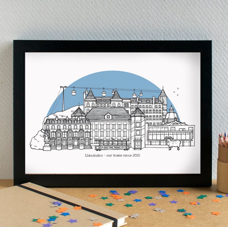 I illustrated this skyline using pen and ink, by hand, and then touched it up digitally to arrive at the final image. It features some hotels on the prom, Venue Cymru, the pier, Grand Hotel, Great Orme, some cable cars, the Alice in Wonderland Statue, Great Orme Tram, a little goat and some seagulls.