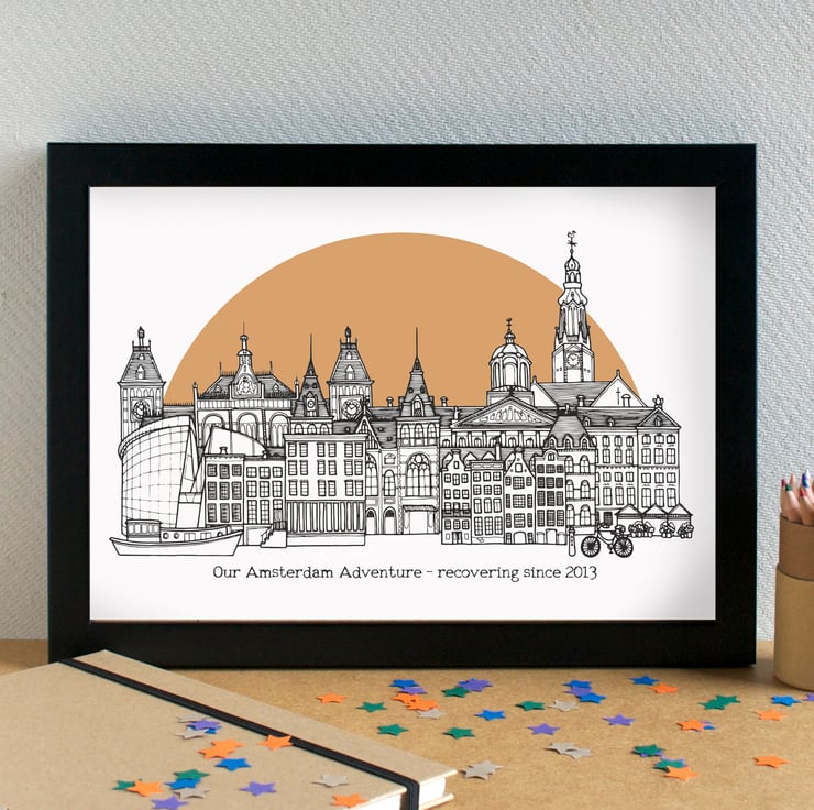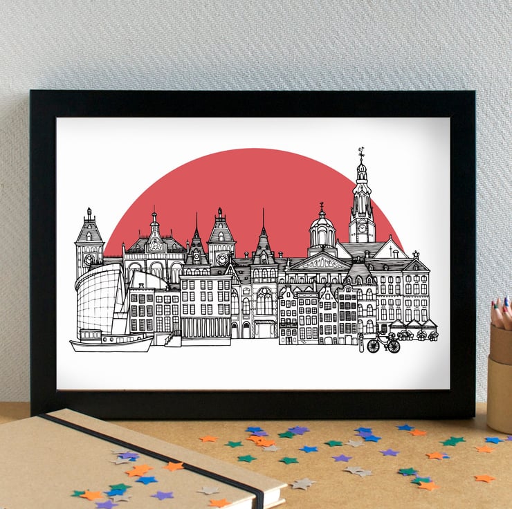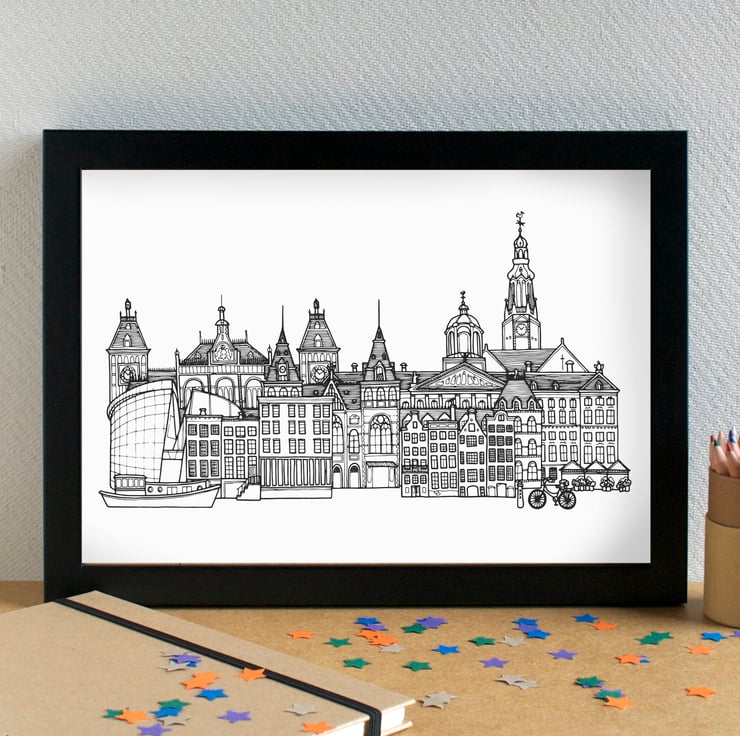 A detailed art print of my skyline illustration of the most famous landmarks in beautiful Amsterdam.