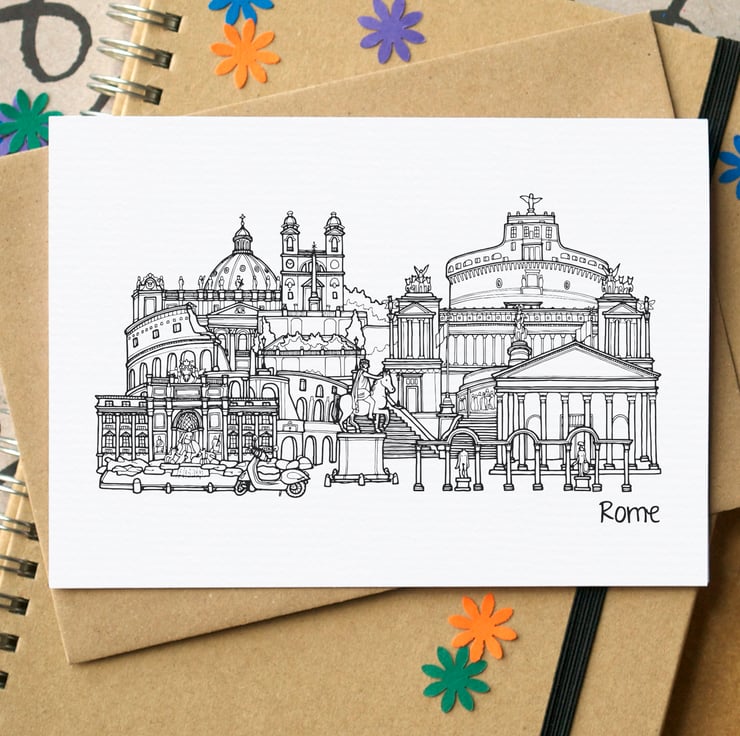 A blank card featuring a line drawn skyline illustration of Rome's greatest landmarks.