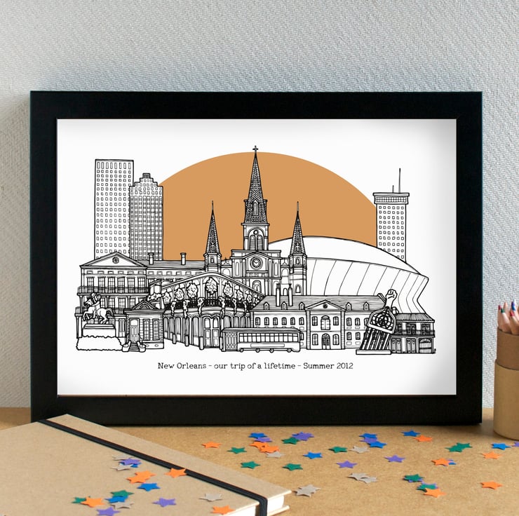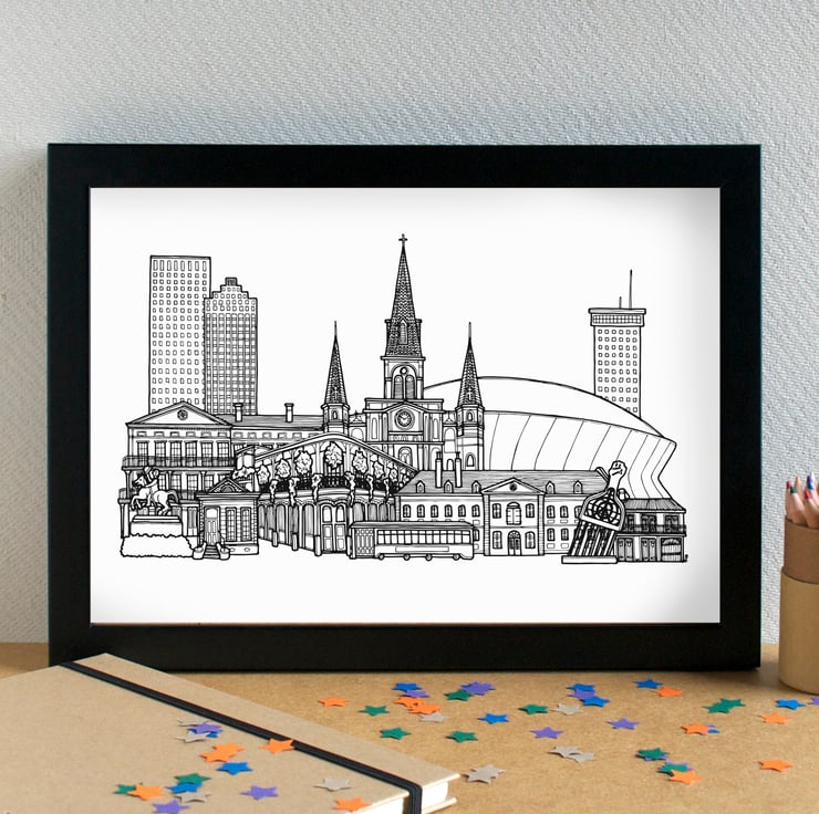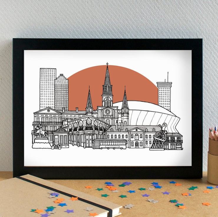 A lovely print of my hand drawn skyline illustration of the most famous landmarks in famous New Orleans, Louisiana.