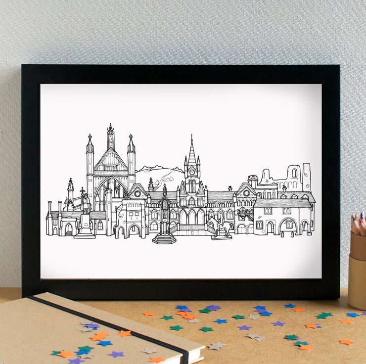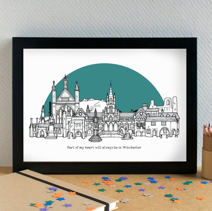 A pretty print of my skyline illustration of the most famous landmarks in Winchester, Hampshire.
