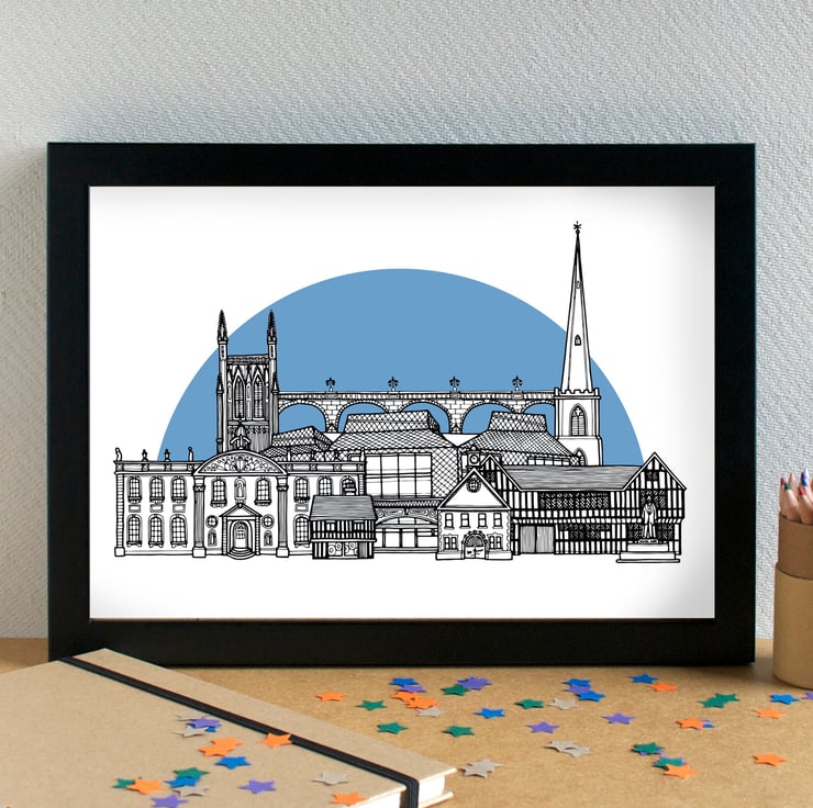 A pretty print of my skyline illustration of the most famous landmarks in Worcester.