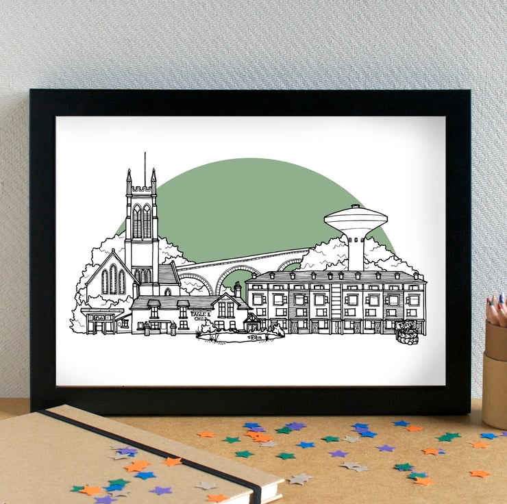 A pretty, detailed print of my skyline illustration of the most famous contemporary landmarks in Halewood, Knowsley.