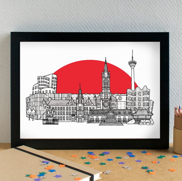 The illustration was drawn using pen and ink, by hand, and has then been digitally manipulated to come up with the final image. It features the Rathaus, the Merkur Spiel-Arena, Schloss Benrath, Kö-Bogen, EKo-Haus der Japanishen Kultur, Neuer Zollhof, Rheinturm, Johanneskirsche, MedienHafen and a little Jan Wellen Equestrian statue.