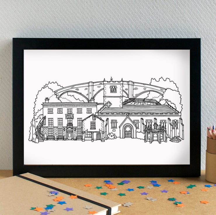 A pretty print of my hand-drawn illustration of the most famous landmarks in Kirkby Lonsdale, Cumbria.
