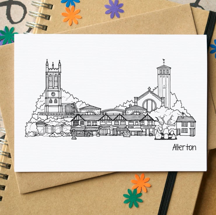 A blank greetings card featuring a special skyline illustration of some of the most iconic and memorable landmarks in South Liverpool's Allerton.