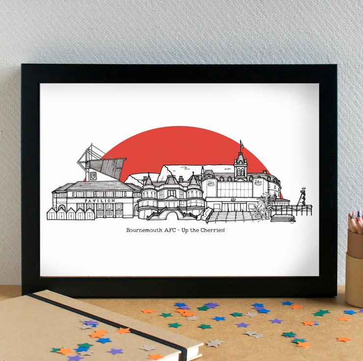 A unique print of my pretty illustration of the most famous landmarks in Bournemouth, with the addition of AFC Bournemouth's Vitality Stadium, and a Bournemouth red "sunshine" background.