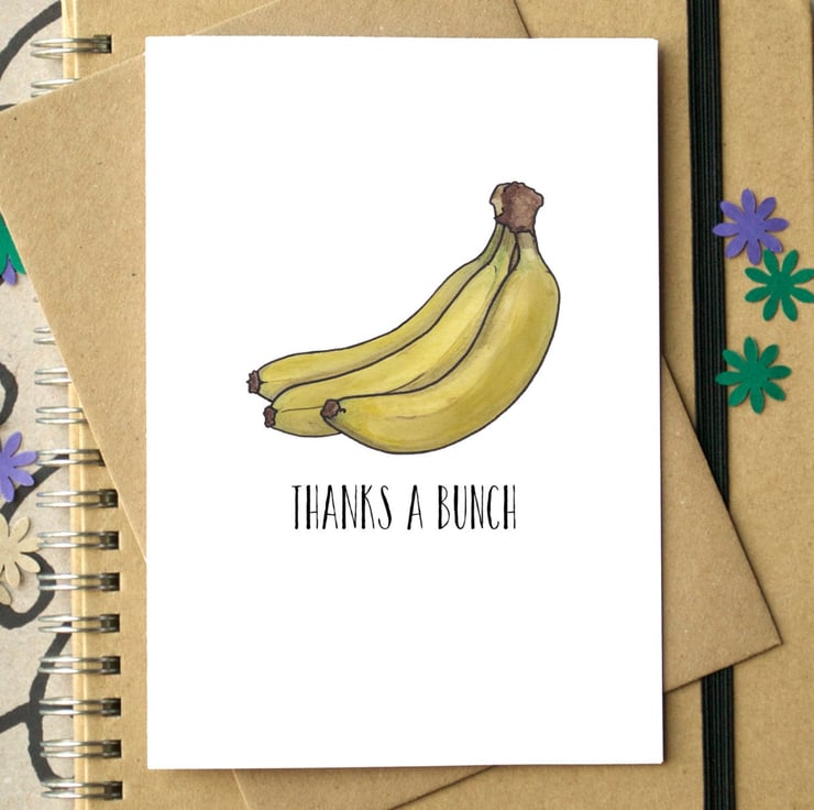 The card features my illustration of a bunch of bananas - which I drew by hand and then coloured with watercolour paint. The phrase "Thanks A Bunch" accompanies the bananas.
