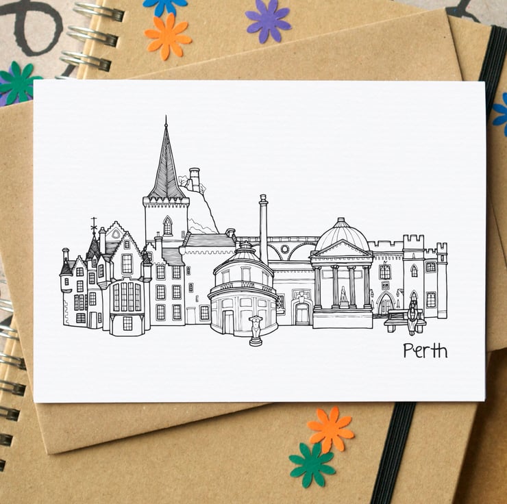 A blank card featuring an illustration of some of Perth, Scotland's greatest landmarks.
