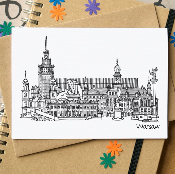A blank card featuring a skyline illustration of some of Warsaw's greatest landmarks.