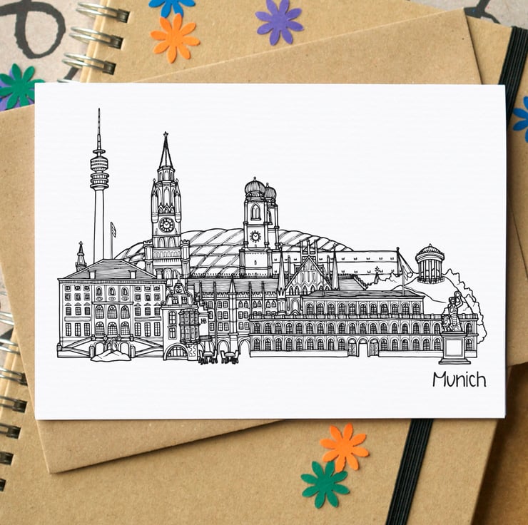 A blank card featuring a skyline illustration of some of Munich's most iconic landmarks.