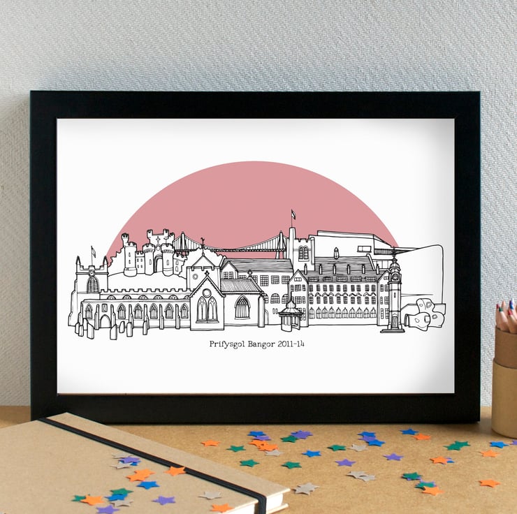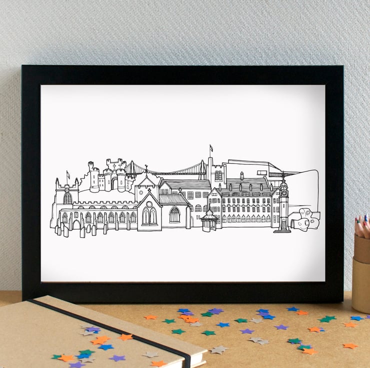A detailed art print of my skyline illustration of the most famous landmarks in Bangor, North Wales.