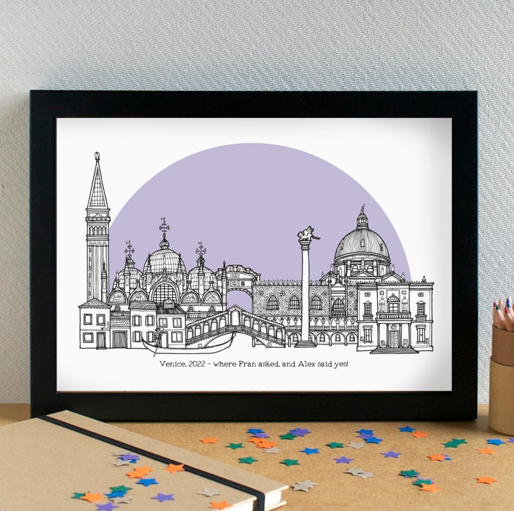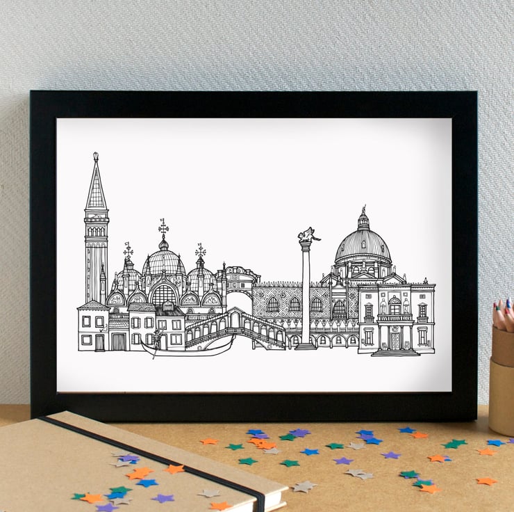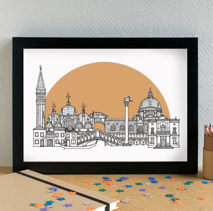 A pretty print of my hand-drawn illustration of the most famous landmarks in Venice.