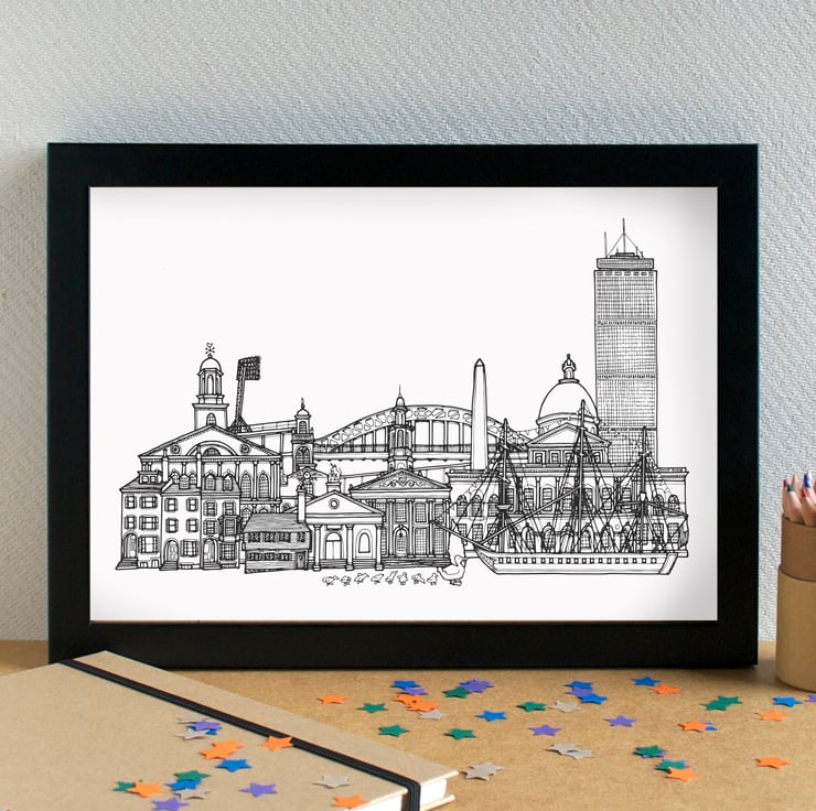 My Boston illustration was drawn using pen and ink, by hand, and has then been digitally manipulated to come up with the final image. It features Faneuil Hall, Old State House, Harvard Business School, Massachusetts State House, Prudential Building, Bunker Hill, BU Bridge, Fenway Park, USS Constitution, Paul Revere's House, Quincy Market and some pretty little terrace houses in Beacon Hill. The whole image is finished with the cute "Make Way for Ducklings" sculpture.