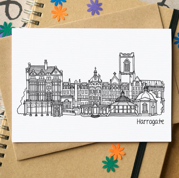 A blank card featuring an illustration of some of beautiful Harrogate's greatest landmarks.