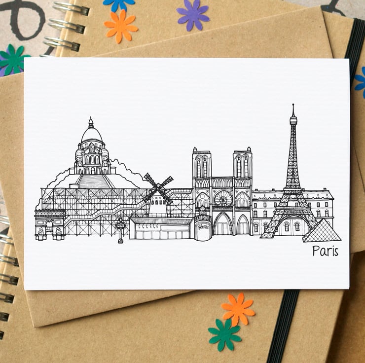 A blank card featuring a skyline illustration of some of Paris's greatest landmarks.