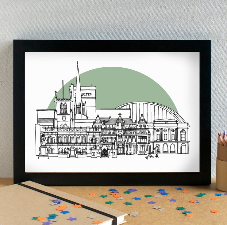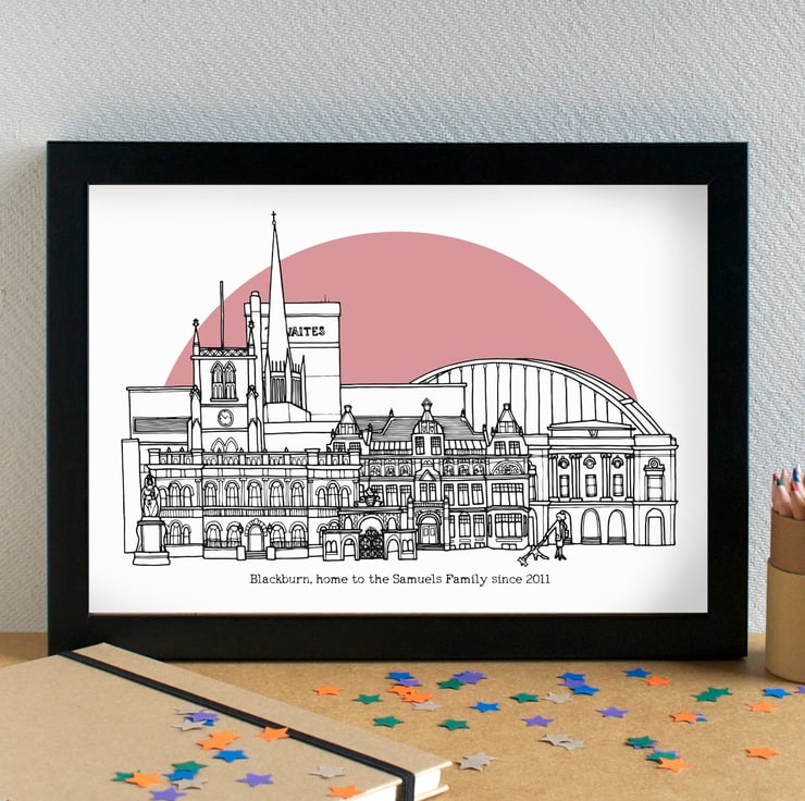 A pretty art print of my hand drawn skyline illustration of the most famous landmarks in Blackburn, Lancashire.