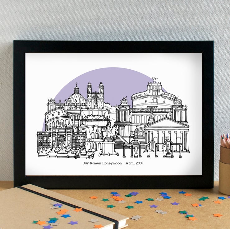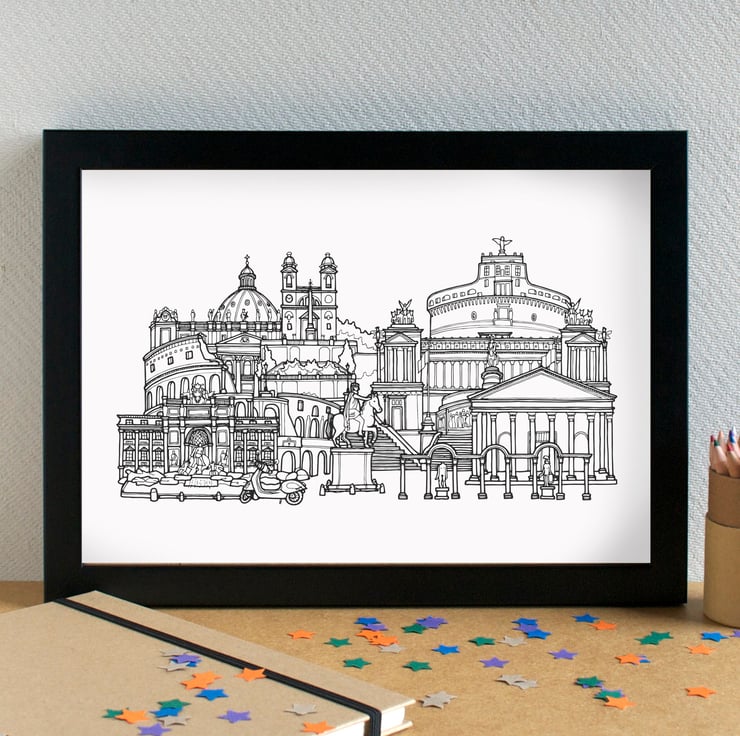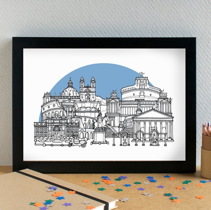 A pretty print of my line-drawn skyline illustration of the most famous landmarks in Rome.