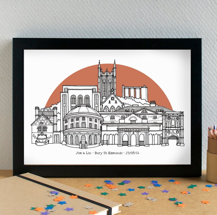 A special print of my hand-drawn illustration of the most famous landmarks in Bury St Edmunds.