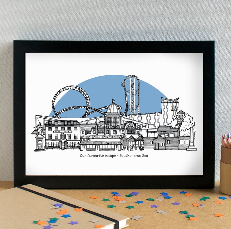 A pretty print of my illustration of the most famous landmarks in Southend-on-Sea, Essex.