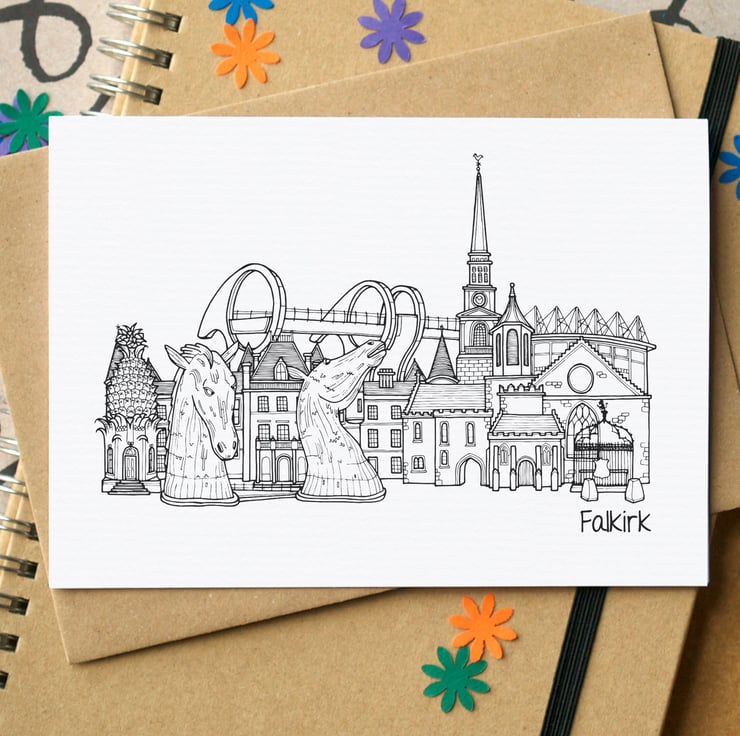 A blank card featuring an illustration of some of Falkirk's most iconic landmarks.