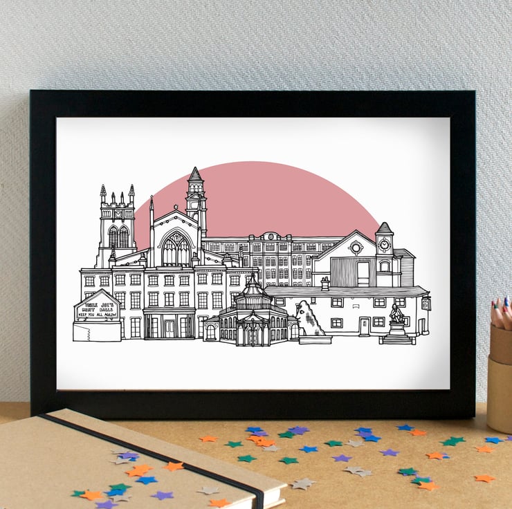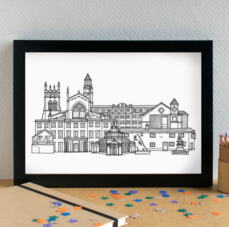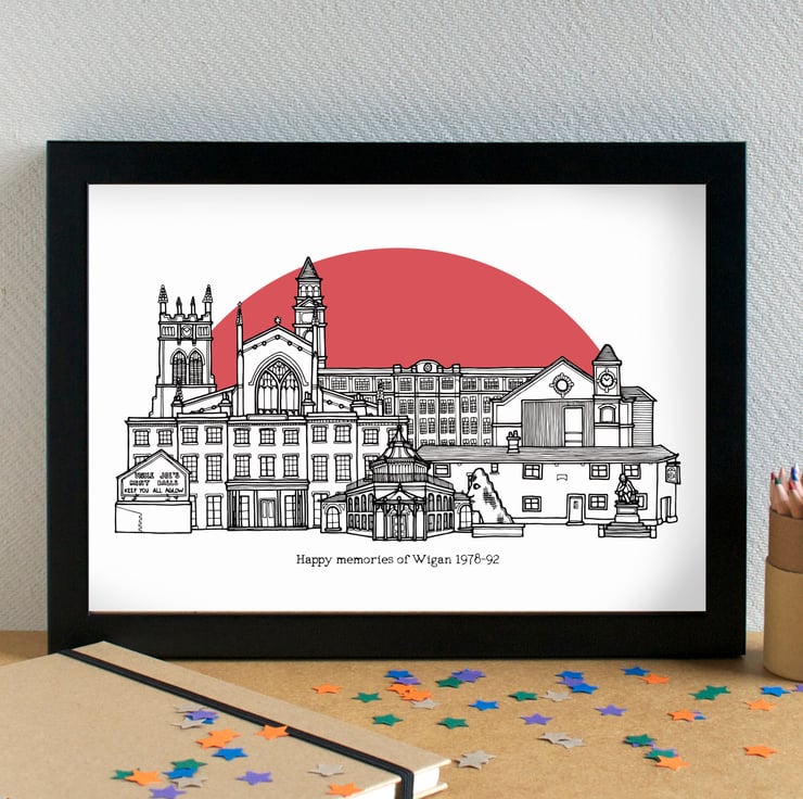 A print of my intricate line-drawn illustration of the most famous landmarks in Wigan.
