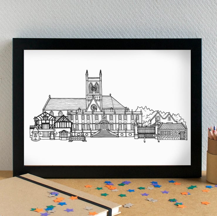 A pretty, detailed print of my skyline illustration of the most famous contemporary landmarks in Liverpool's West Derby.