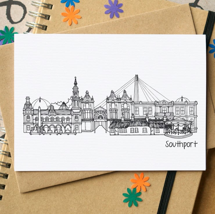 A blank card featuring a special skyline illustration of some of Southport's most iconic landmarks.