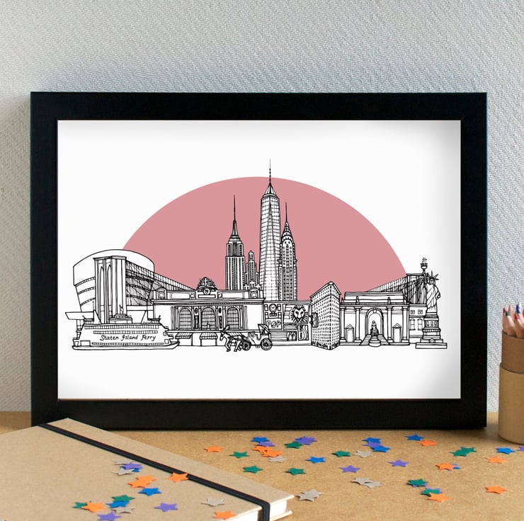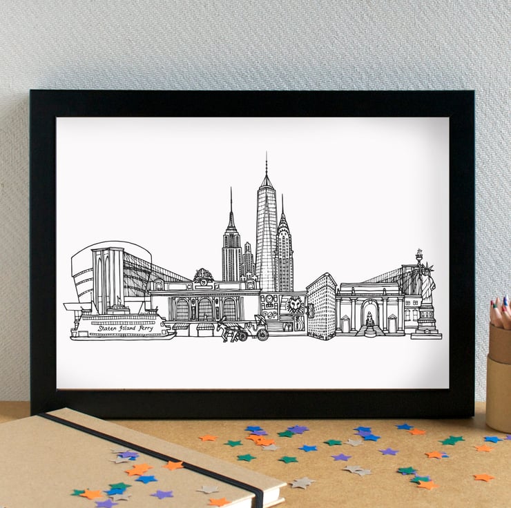 My New York skyline illustration was drawn using pen and ink, by hand, and has then been digitally manipulated to come up with the final image. It features the Guggenheim Museum, the Brooklyn Bridge, Grand Central Station, the Empire State Building, Rockerfeller Center, the One World Trade Center, the Chrysler Building, Times Square, the Flatiron Building, the Natural History Museum, the Statue of Liberty and is finished with the Staten Island Ferry and a horse and carriage from Central Park.