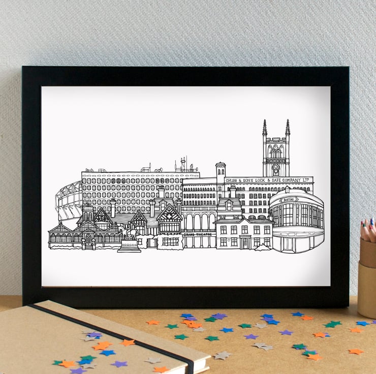 A pretty print of my skyline illustration of the most famous landmarks in Wolverhampton.
